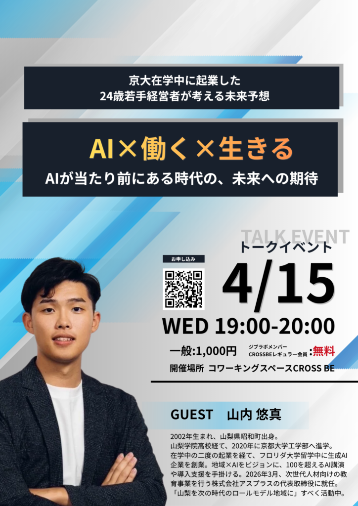 2002年生まれ、山梨県昭和町出身。山梨学院高校、京都大学工学部卒。 在学中の二度の起業を経て、フロリダ大学留学中に生成AI企業を創業。地域×AIをビジョンに、これまで100を超えるAI講演や導入支援を手掛ける。 2026年3月、次世代人材向けの教育事業を行う「株式会社アスプラス」代表取締役に就任。 「山梨を次の時代のロールモデル地域に」すべく、最前線で活動中。