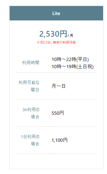 | レギュラー会員・ライト会員 | ¥1,650/1時間 | ¥2,200/1時間 |